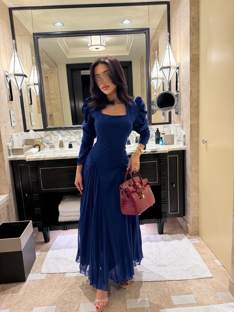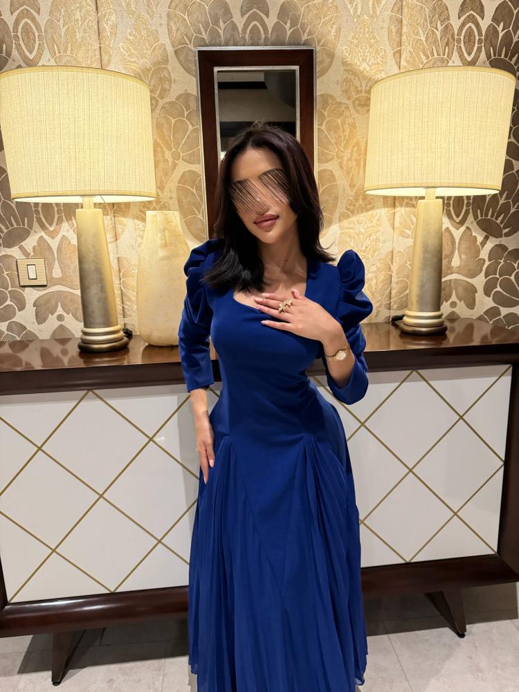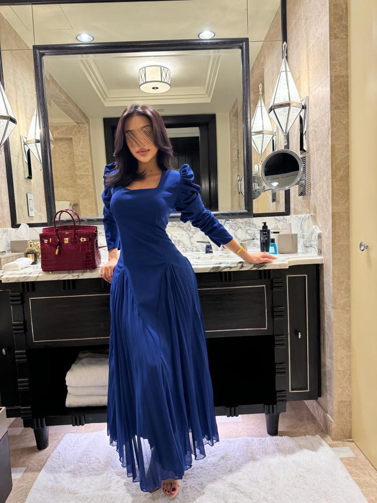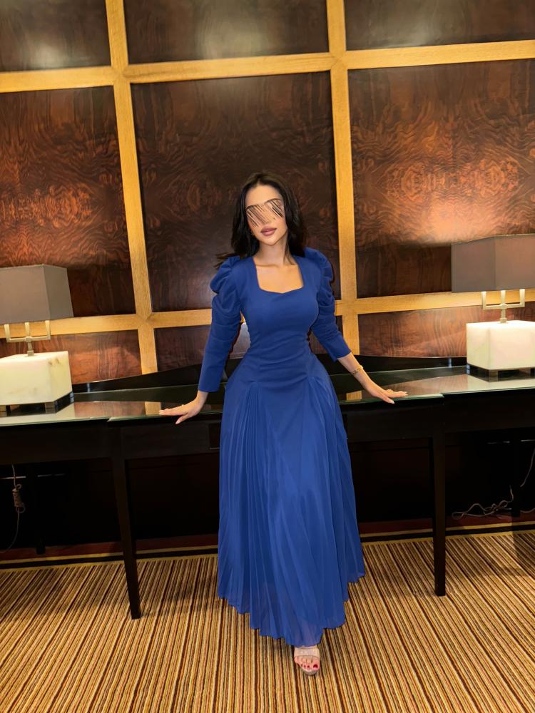 فستان طويل بلون أزرق ملكي، يتميز بقماش شيفون ناعم مع لمسة من القماش المطاطي في الجزء العلوي لتوفير الراحة والمرونة. يأتي الفستان بأكمام طويلة بتصميم منتفخ قليلاً من الأعلى تضيف حجماً وأناقة للكتف، مع قصة مستقيمة من الأعلى وتنورة واسعة بكسرات ناعمة، ليكون خيارًا مثاليًا ضمن فئة فساتين ناعمة وطويلة.