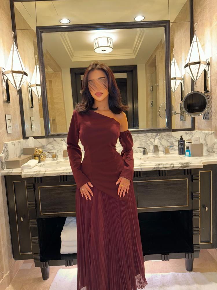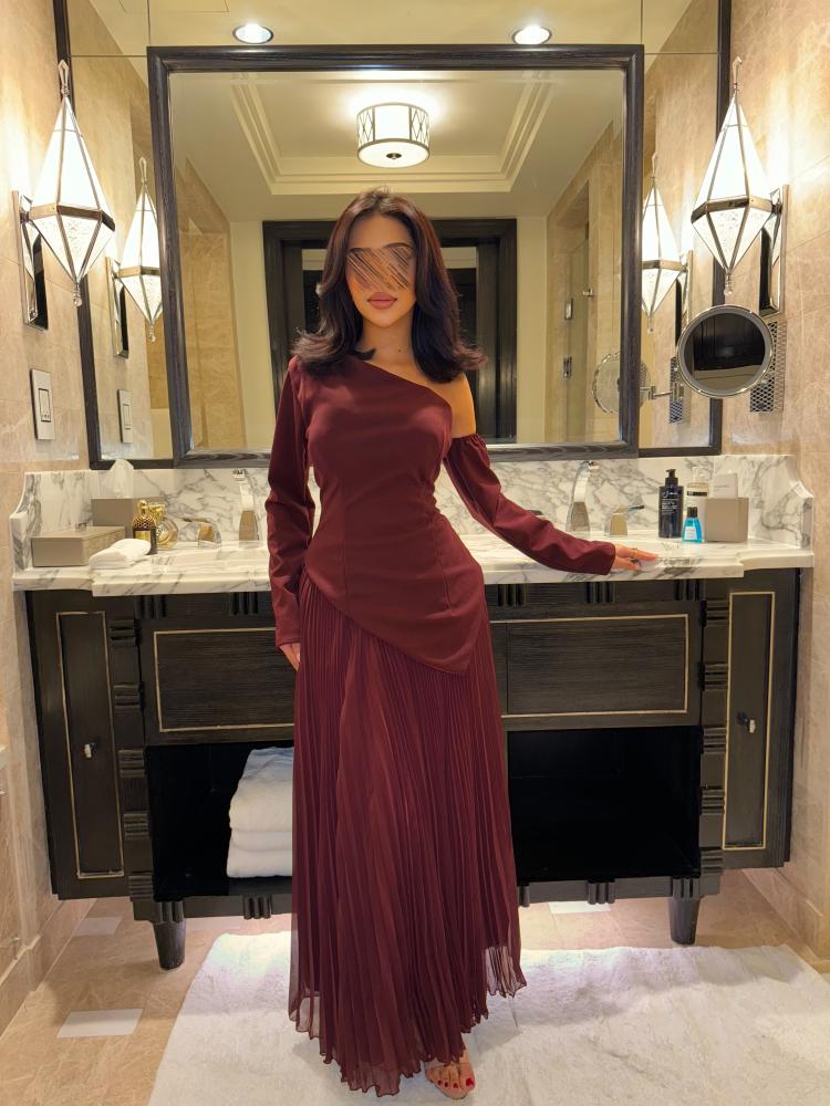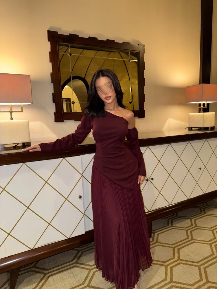 فستان طويل بلون عنابي داكن، مصنوع من خامة خفيفة شفافة بطبقة داخلية مبطّنة، بتصميم وان شولدر بكم واحد طويل مع تنورة بكسرات ناعمة. ينتمي هذا التصميم إلى فئة فساتين سهرة وفساتين ناعمة التي تليق بالمناسبات المسائية الراقية.