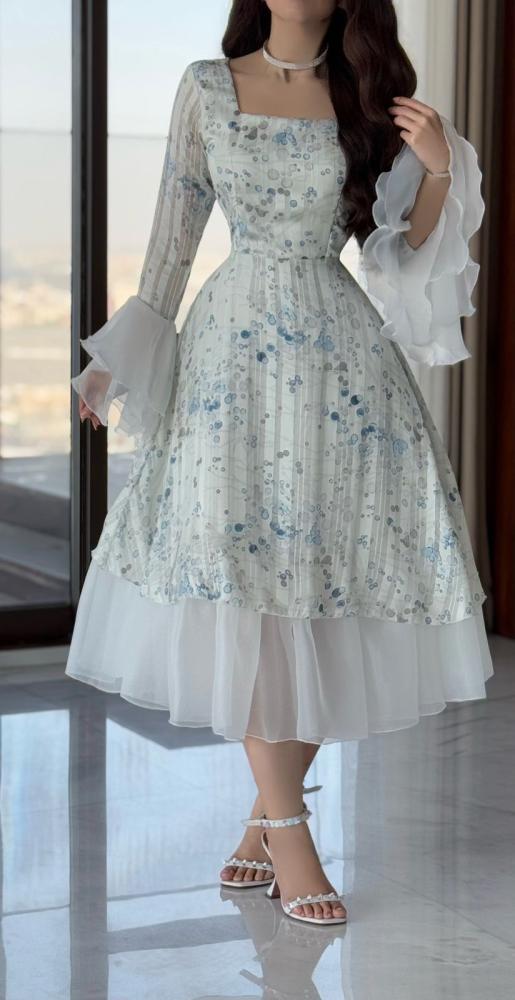 ما أجمل إطلالتك سيدتي مع فستان ناعم أبيض الذي يعتبر خيار الأنيقات صممه لكِ إلنورا لتتألقي من قماش رائع باللون الأبيض بنقوش زهور زرقاء، مع قصة صدر مربعة وأكمام طويلة جرس تنتهي بكشكشة.