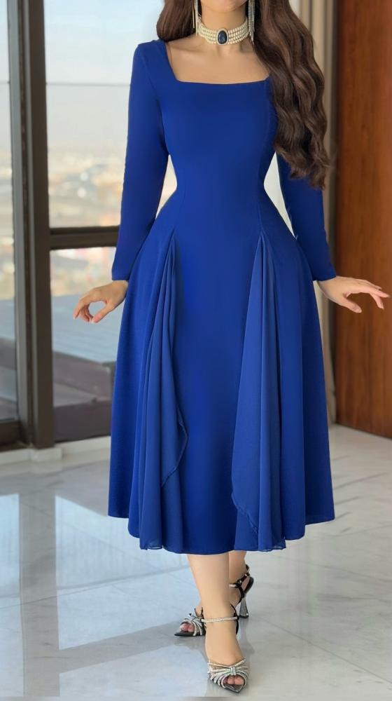 تعشقين كل جميل ولذلك ستعشقين أميرتي فستان سهرة ناعم وميدي أزرق من أول نظرة، المقدم من متجر إلنورا لكِ، والمصمم من خامة ناعمة مع أكمام طويلة ضيقة وقصة صدر مربعة، أما عن القصة فهي محددة عند الخصر وتنتهي بتنورة واسعة.