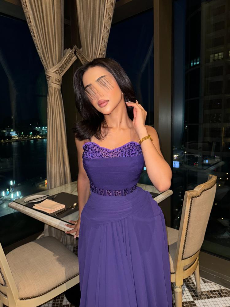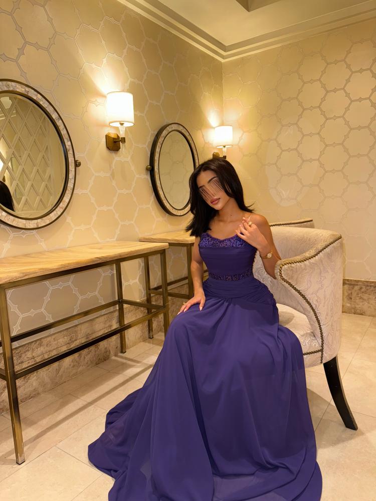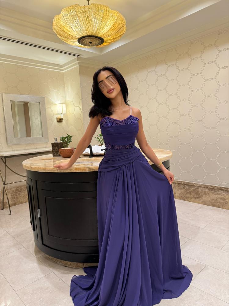 فستان سهرة طويل باللون البنفسجي الداكن، مصنوع من قماش شيفون ناعم، يتميز بتصميم بدون أكمام وقصة ضيقة من الأعلى مع تنورة واسعة ومنسدلة. الفستان مصمم ليناسب فئة فساتين سهرة ويجمع بين البساطة في الشكل والتميز في التفاصيل.