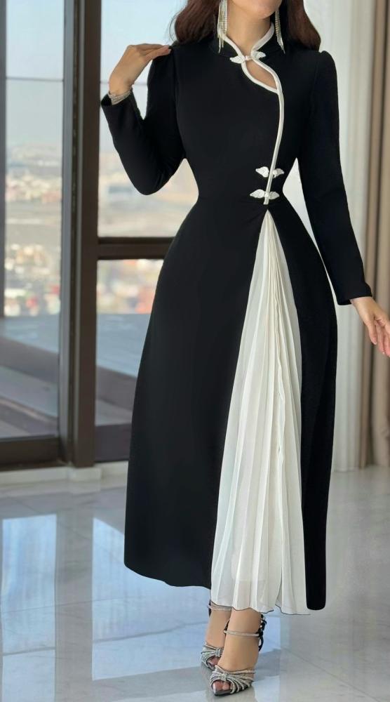 لأن الجمال في التفاصيل اختاري أرقى فستان ناعم أسود بأكمام طويلة من متجر إلنورا، مصمم من قماش ناعم بلون أسود مع تدخيلة بلون أبيض من البليسيه على التنورة، وياقة صينية مرتفعة مع فتحة صدر مائلة، وقصة خصر ضيق وتنورة واسعة بطول أنيق.
