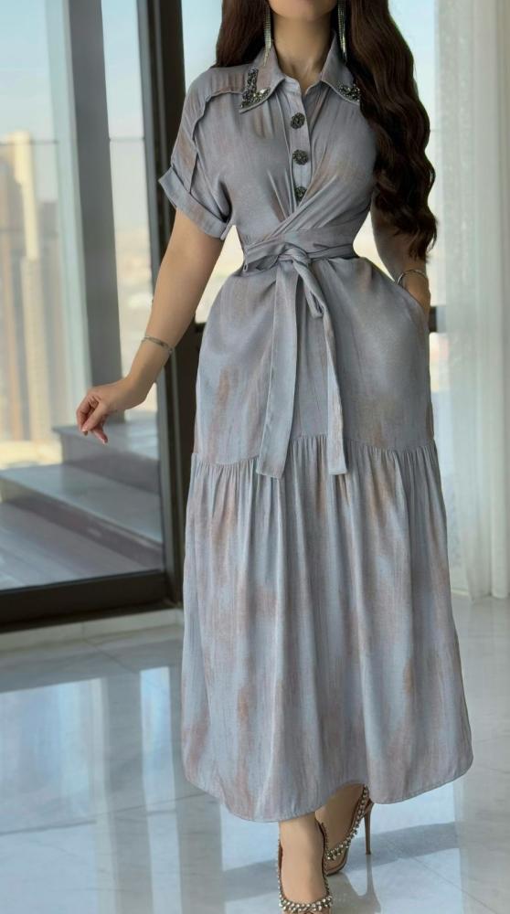 لن تكتشفي الأناقة إلا من خلال ارتداء فستان ناعم طويل رمادي بأكمام قصيرة من متجر إلنورا الذي صممه لكِ بكل حب من قماش ناعم باللون الرمادي مع ياقة بقبة مميزة وأزرار أمامية وخصر برباط، وتنورة طويلة بطيات واسعة.