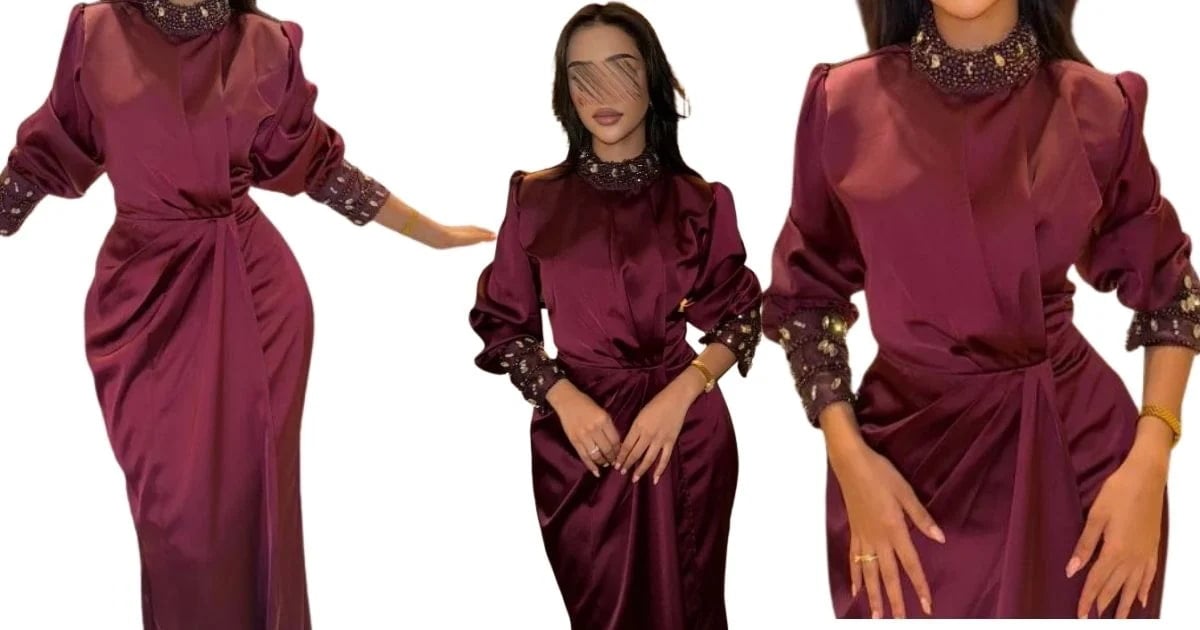 فستان سهرة بأكمام طويلة مصمم من قماش ساتان بلون تعشقه الجميلات عنابي لامع، قصته مميزة بخصر محدد وتنورة مستقيمة وتطريز يُزين أساور الأكمام والياقة، اطلبيه الآن من متجر إلنورا بأفضل سعر.